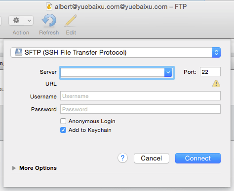 In CyperDuck, we need to select SFTP protocol, select the 22 as port number, and enter the ip address for the virtual server in DigitalServer. As for the username and password, we can use 'root' as the username, and password can be send by DigitalOcean with email. We can also create other users in the virtual server and use the other user name and password to connect to CyperDuck.